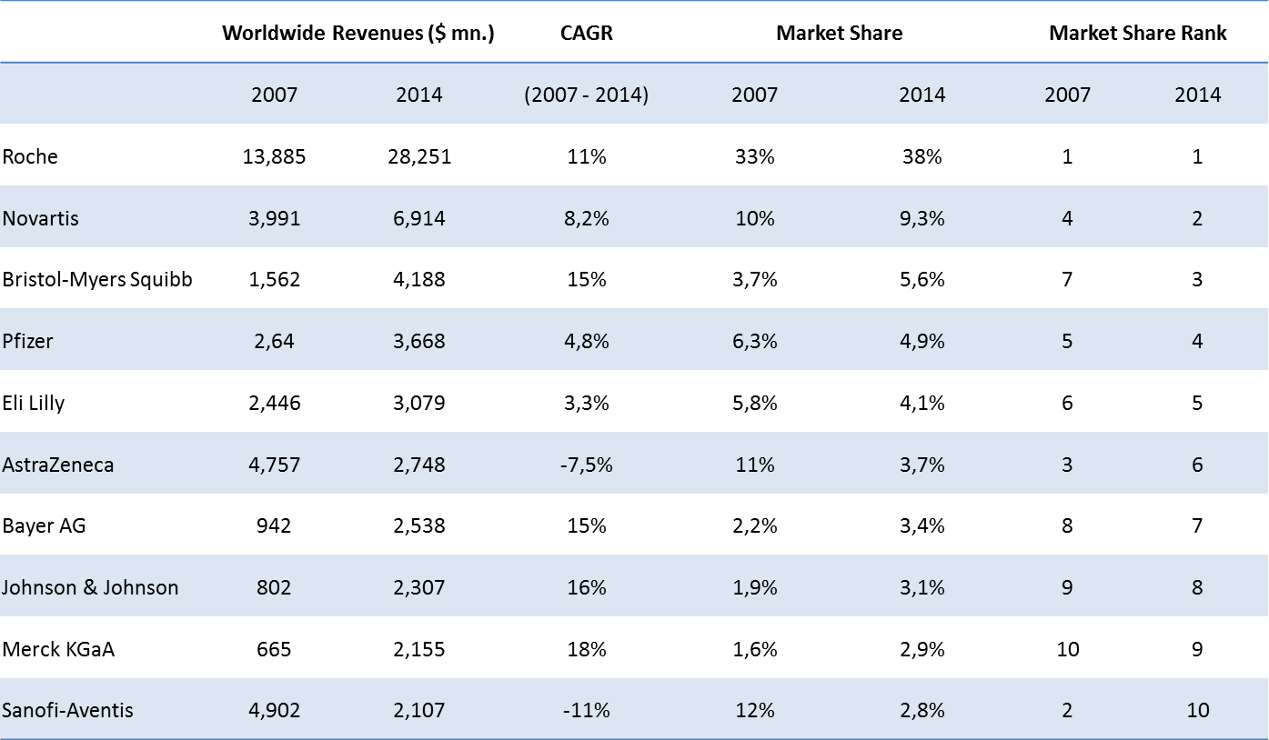 - Patent Cliff: Patent expirations between 2010 and 2014 put at risk at least US$ 100 bn and major oncology drugs are at stake.