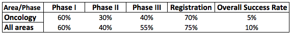 Figure 1 shows that the overall success rate of Oncology drugs is half of that of all other areas (on average). Although oncology approval rates are low, according to IMS Health oncology market has the largest share compared to other disease areas ($US 42 bn, ~7% of global pharma market) with compound annual growth rate (CAGR) of 10,5% (Figure 2).