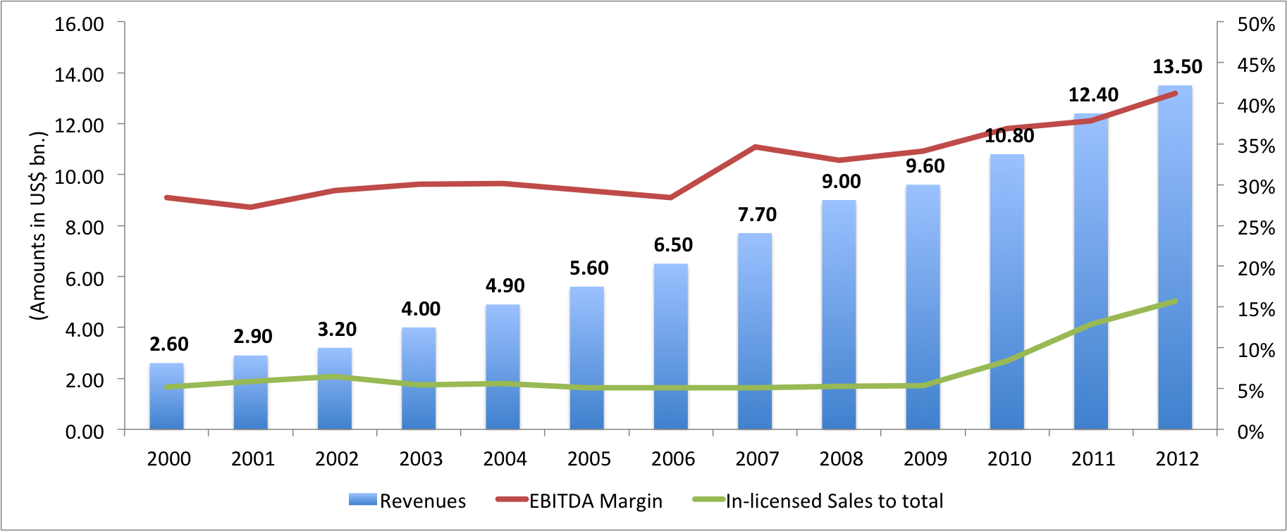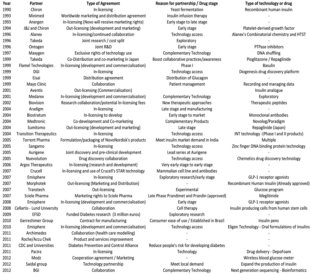 Novo Nordisk’s business model will be discussed in order to demonstrate how one can identify and analyse the business model of a company (Figure 1 shows the main financials of Novo Nordisk). Novo Nordisk is one of the industry leaders within the field of insulin delivery devices market. More specifically, Medtronic has 20% share of that market while Novo Nordisk and Sanofi have 16% and 15% of the sector’s market share, respectively (Global Information Inc, 2012). Thus, in order for the three key players to at least maintain their market share, they should have a growth rate equal or greater than that of the market overall. One of the key characteristics of Novo Nordisk is its specialised R&D portfolio; both in the medical devices industry and the drug market the focus is on diabetes and insulin-related diseases. This characteristic can be perceived both as an advantage and a disadvantage. On the one hand, such specialisation may build a competitive advantage for the company as well as a brand over diversified organisations with multi-segment products and services. On the other hand specialised R&D, could be highly risky as it can make the company increasingly dependent on a specific market segment. For instance, if another entity discovers a product that can disrupt the diabetes market as a whole, then Novo Nordisk (or other “specialised” companies in that case) will be negatively affected. One way to compensate for such threat is forming strategic alliances and partnerships in which there is risk and value sharing. This is the point where the importance of business model becomes extremely significant.