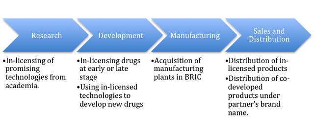 - Partial integration: this includes companies that exist only at certain points of the value chain. For instance, early or mid-stage biotech companies are research driven and either outsource development and manufacturing processes or out-license their product. Contract Research Organisations (CROs) and Contract Manufacturing Organisations (CMOs) are also examples of such business model.