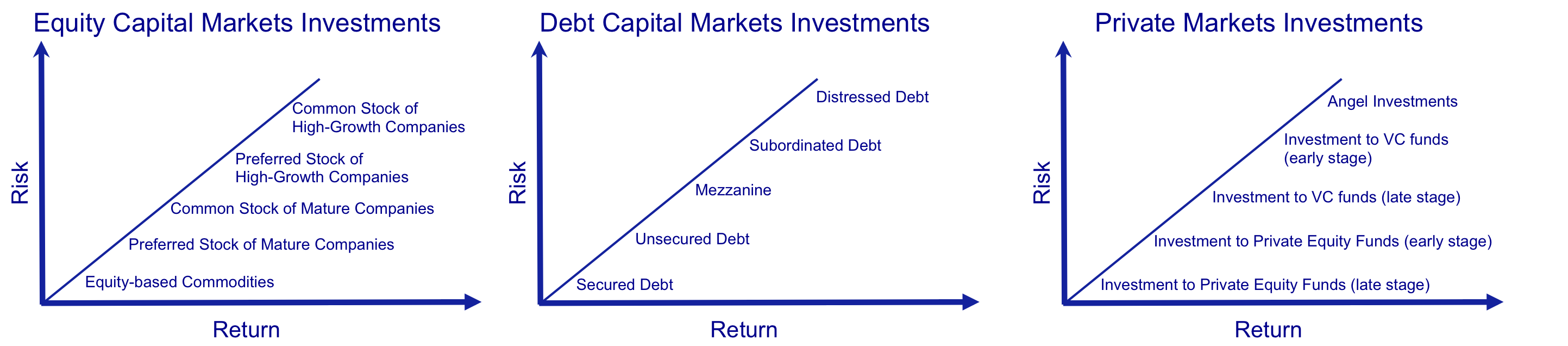 An additional strategy can be using a small percentage of net income as capital investments to other companies. The figure below shows the types of investments (public equity, public debt and private) that can be made assessed by their level of risk and return (click on the figure to see graphs more clearly):