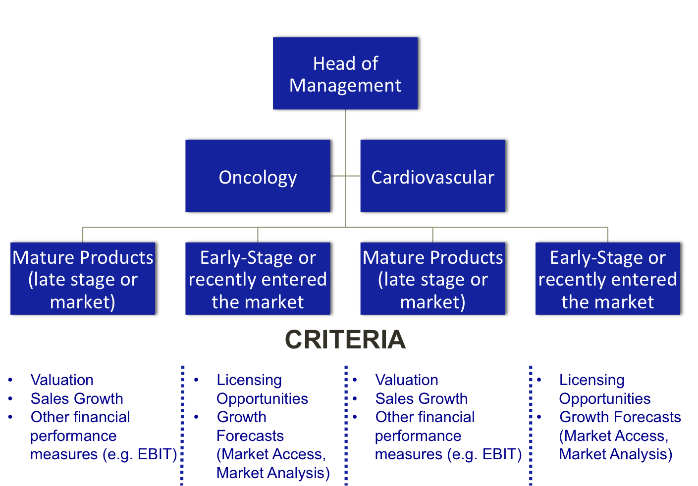 Organisation Restructuring requires evaluating, valuing and prioritising the main assets of the company. For example, if your company has multiple business divisions and business units can have “subunits”. As an example, considering a fully integrated pharmaceutical company which its operations lie on two main therapeutic : oncology and cardiovascular in which they are both split in mature products and early-stage products. Valuing the projects or the business units based on financial performance (e.g. sales growth, EBIT margins) is crucial for the firm (see figure below).