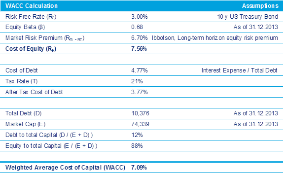 As a next step the discount rate (WACC) is calculated by estimating the cost of equity (using the Capital Asset Pricing Model) and the cost of debt defined as interest expense over total debt (Figure 2)