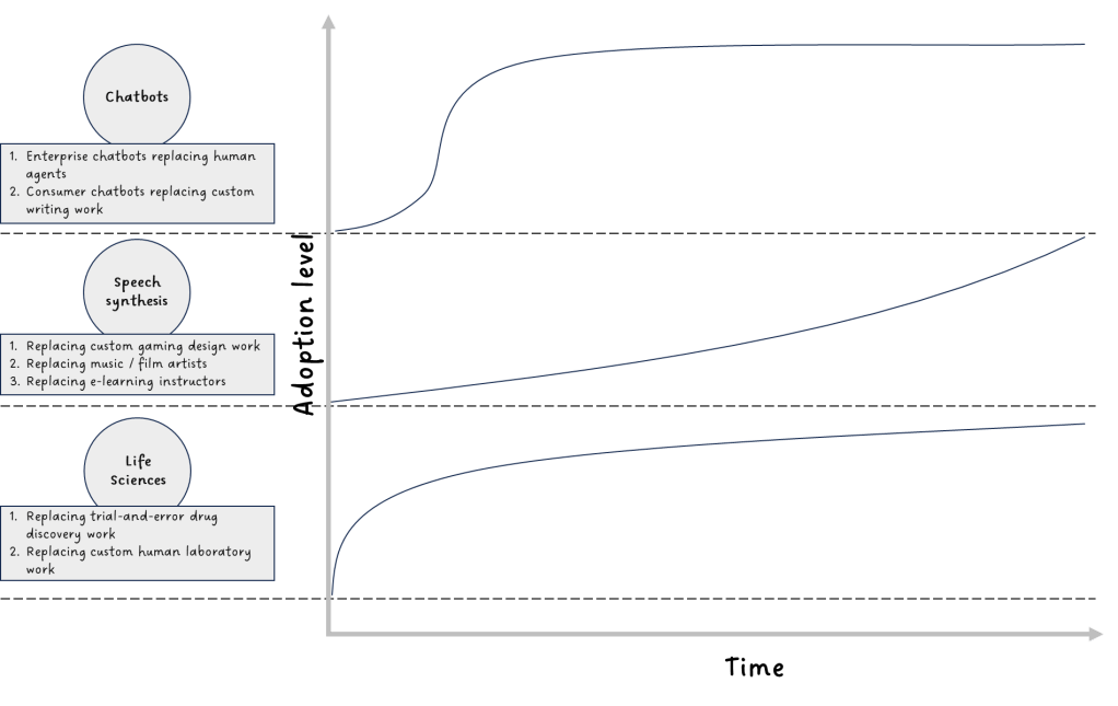 Recent developments in AI, more specifically generative AI (or genAI) is a case in point. Although genAI has not reached the point of replacing existing markets, remarkable progress has been made over the past few years towards achieving this goal. Since 2020, the release of several genAI tools such as language model-based chatbots (GPT-3/4, BARD, Anthropic), image generation applications (DALL-E, you.com) and speech synthesis applications (Synthesia, Altered AI) has led to increased awareness and adoption by enterprises as well as consumers. GenAI is also being adopted in more scientifically and technologically demanding spaces such as Life Sciences (drug discovery, clinical trials) and Manufacturing / production (e.g. robotic automation).